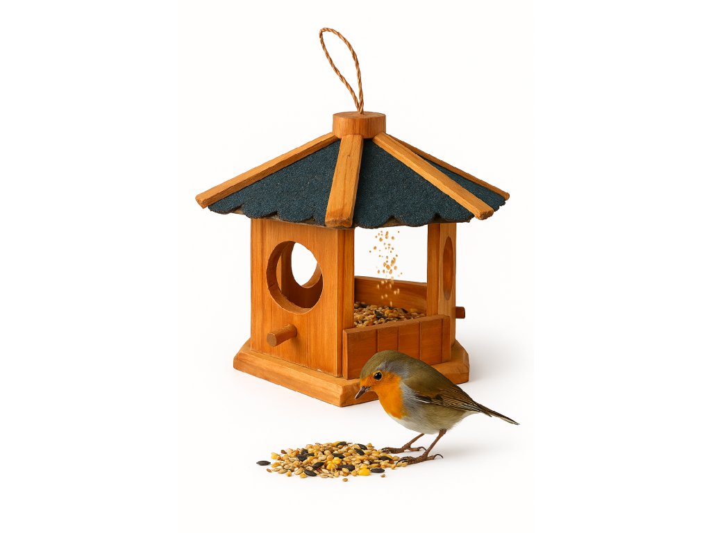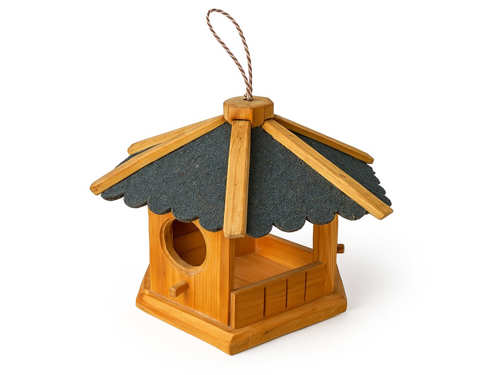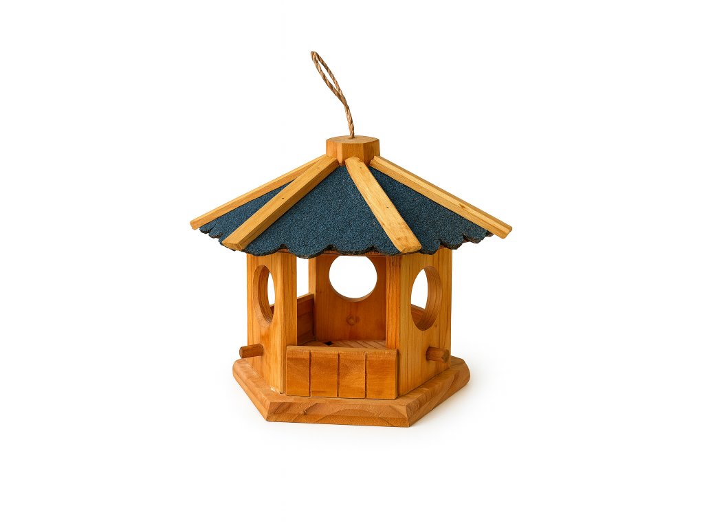 Priestranné drevené kŕmidlo pre vtáky s rozmermi 32×32×24 cm. Pevná konštrukcia a šikmá strecha chránia krmivo pred počasím. Vhodné na zavesenie aj postavenie. Farba šindľa sa môže líšiť podľa aktuálnej dostupnosti.